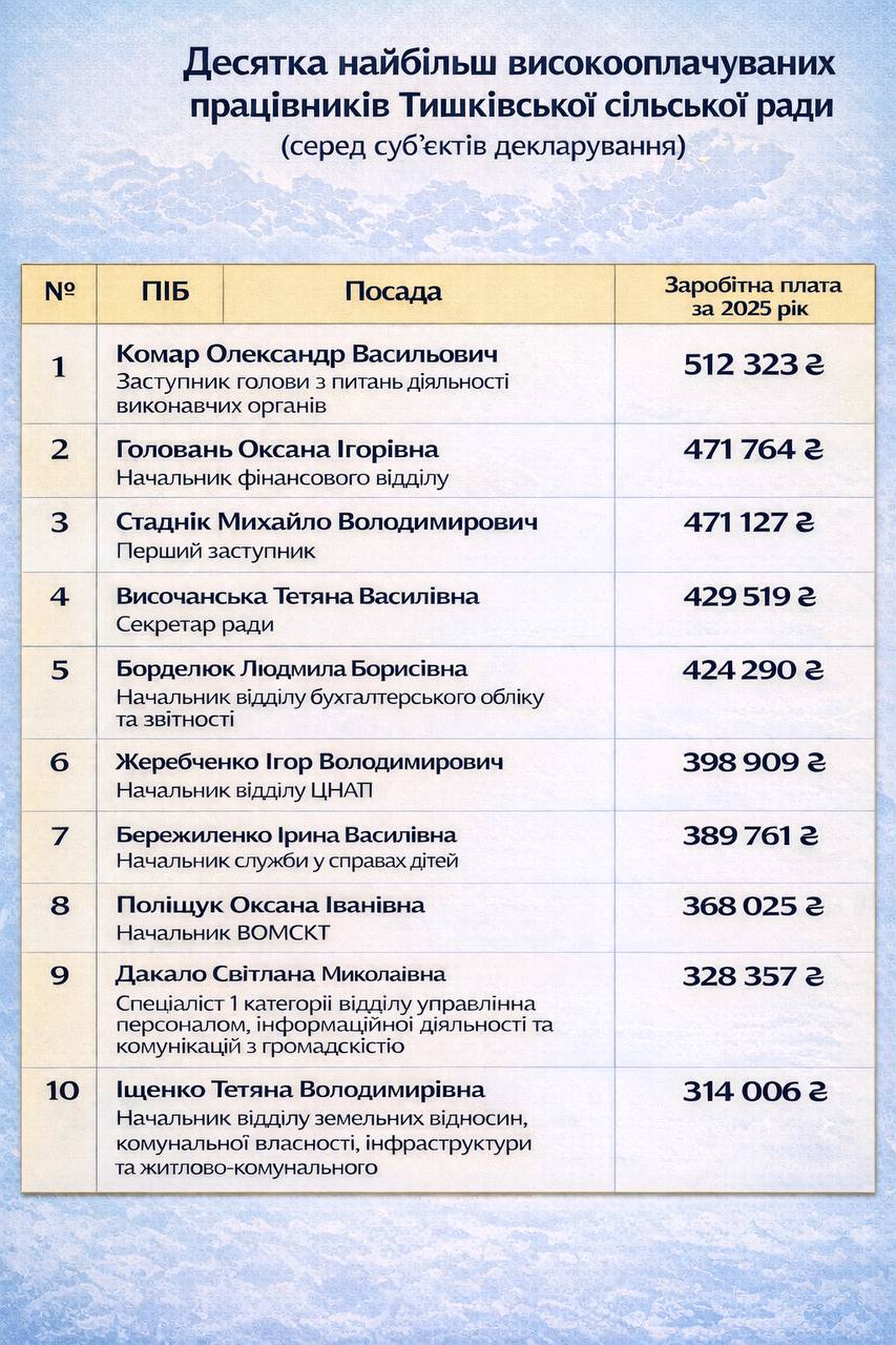 До прикладу, тамтешній заступник голови селищної ради Микола Бурдига заробив 580 тисяч 685 гривень. Секретар селищної ради Олександр Зубець – 426 тисяч 998 гривень. Начальник фінансового відділу Тетяна Пташник отримала торік 551 тисячу 544 гривні.